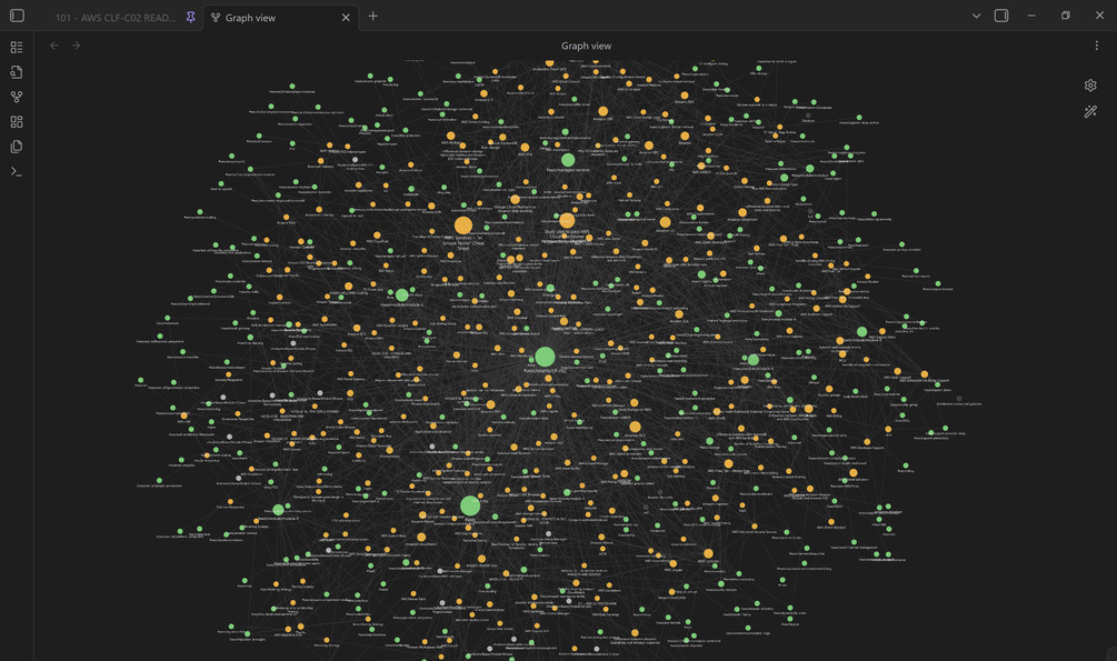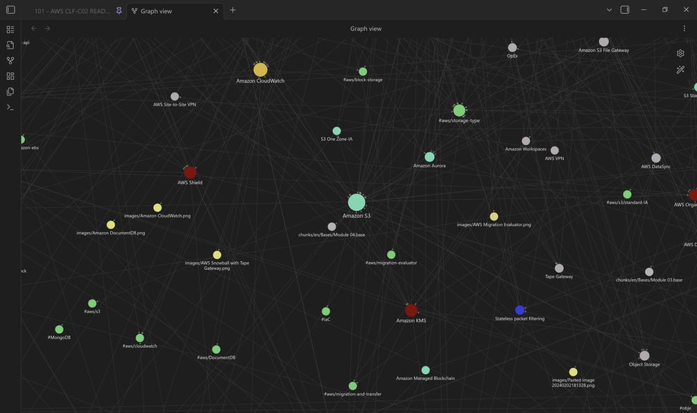 It is a knowledge base in the form of an Obsidian vault with more than 340 files in english (Nodes), with the topics related to the AWS Cloud Practitioner Essential (CLF-C02) certification topics, so that you can take this vault, explore it and customize it to your needs, tastes and your own understanding.