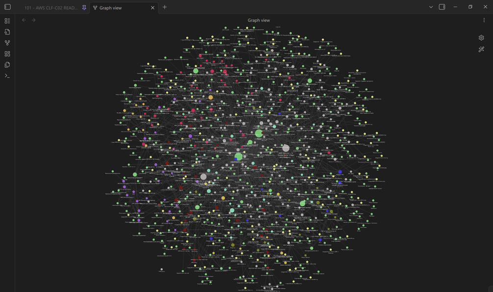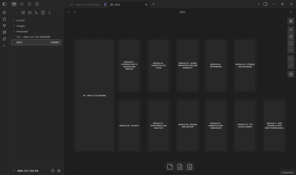 It is a knowledge base in the form of an Obsidian vault with more than 340 files in english (Nodes), with the topics related to the AWS Cloud Practitioner Essential (CLF-C02) certification topics, so that you can take this vault, explore it and customize it to your needs, tastes and your own understanding.